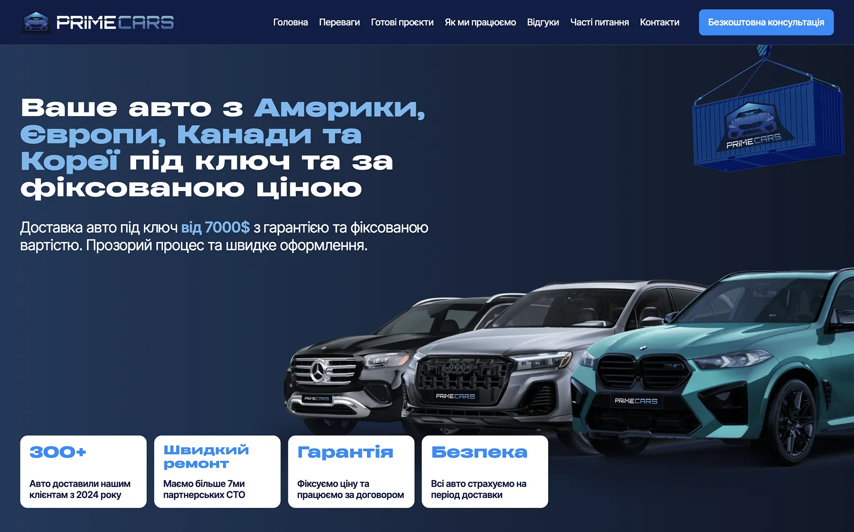 Лендінг для компанії, яка займається пригоном авто із різних країн світу, починаючи з Америкою і закінчуючи Кореєю. Ціль сайту - зібрати заявки на безкоштовну консультацію, та ознайомити відвідувача із автомобілями, які були відновлені та доставлені клієнтам.